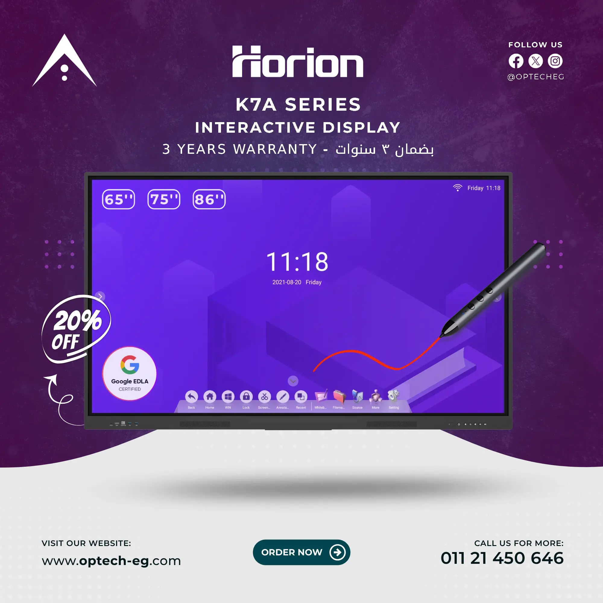 الشاشات التفاعليه من HORION تم تصميمها لتتفاعل مع المستخدم فتكون أداة إدخال وإخراج البيانات وعرض ومعالجة لها أيضا، فوجودها في القاعات التعليمية او المؤسسات يغني عن جهاز الحاسب وجهاز العرض، بل والسبورة التفاعلية.